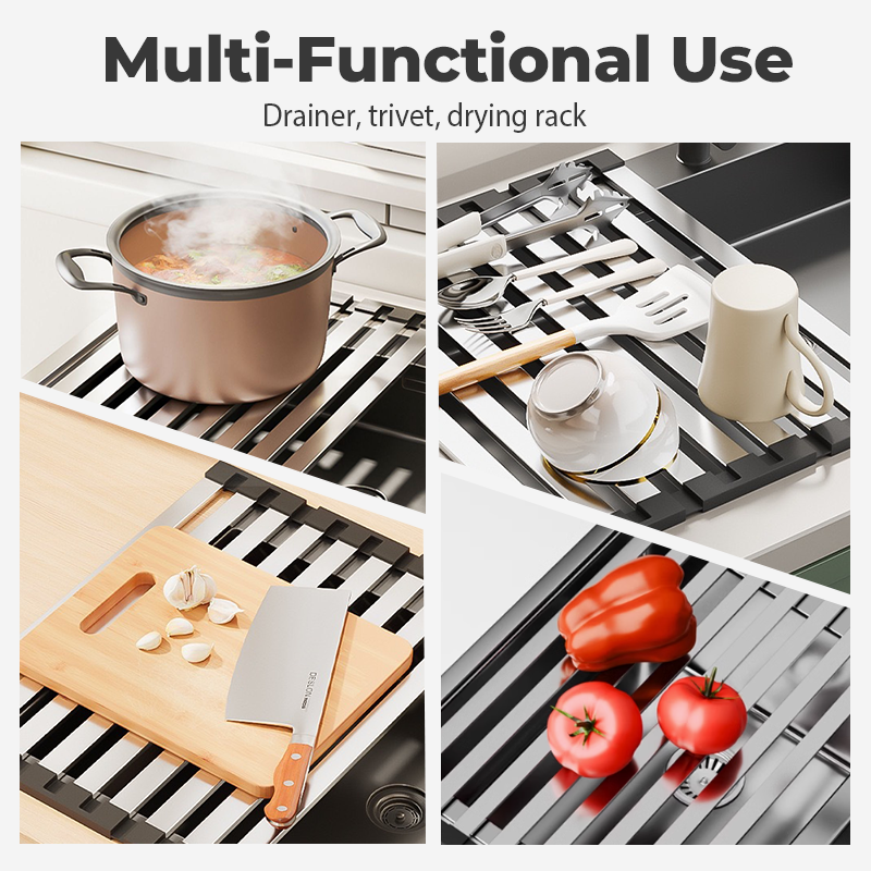 ANTI-SLIP SILICONE EDGES - Soft silicone edges prevent slipping while protecting your hands and surfaces. Ensures stable placement over the sink without sliding or scratching.