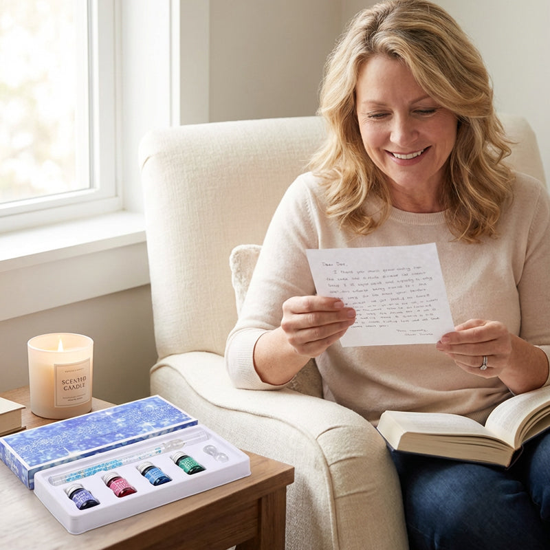 COMPLETE GIFT SET - Beautifully packaged with a glass pen, four inks, and a pen rest, this all-in-one set is an ideal gift for artists, writers, and anyone who appreciates beautiful stationery.