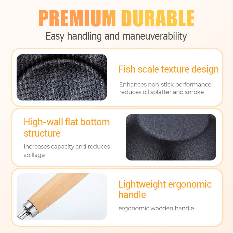 NON-STICK FISH SCALE TEXTURE DESIGN – The inner walls and bottom of the pan feature a unique fish scale pattern that enhances non-stick performance, reduces oil splatter and smoke, and ensures even cooking.