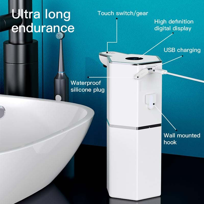 FOUR FOAM OUTPUT MODES AND DIGITAL DISPLAY: The dispenser features four foam output modes for customizable soap dispensing. The digital display shows the mode and battery level, making it easy to monitor and adjust settings as needed.