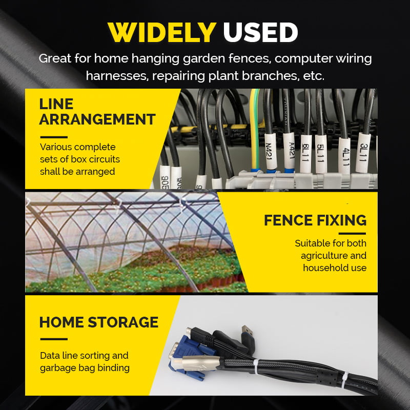 - Cable ties are great for home, office, garage, travel, hanging garden fences, computer wire harness, repairing plant branches, etc. It's also a great choice when you need to tidy up different wires, zippers, and other accessories.