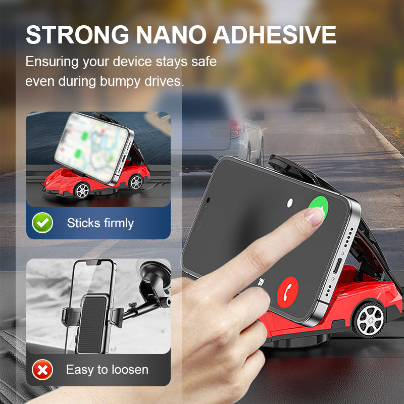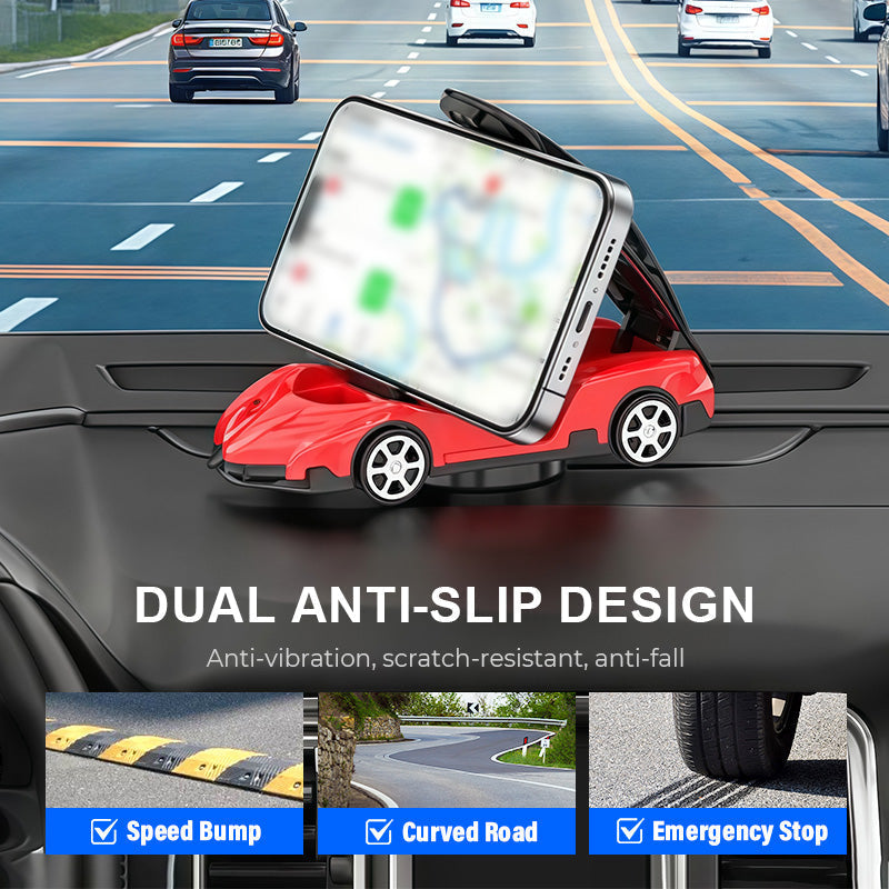 SLEEK SPORTS CAR DESIGN - This mount features a stylish sports car-inspired design that adds a modern, cool look to your dashboard or desk while holding your phone securely in place.
