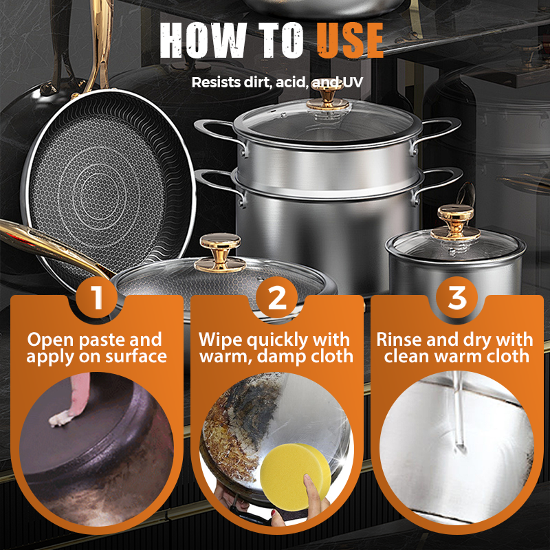RUST REMOVAL & PREVENTION – Designed to break down rust at the source, this paste not only removes existing corrosion but also helps prevent further rusting. Ideal for metal tools, sinks, and bike parts, it restores original shine while creating a protective effect that delays oxidation.